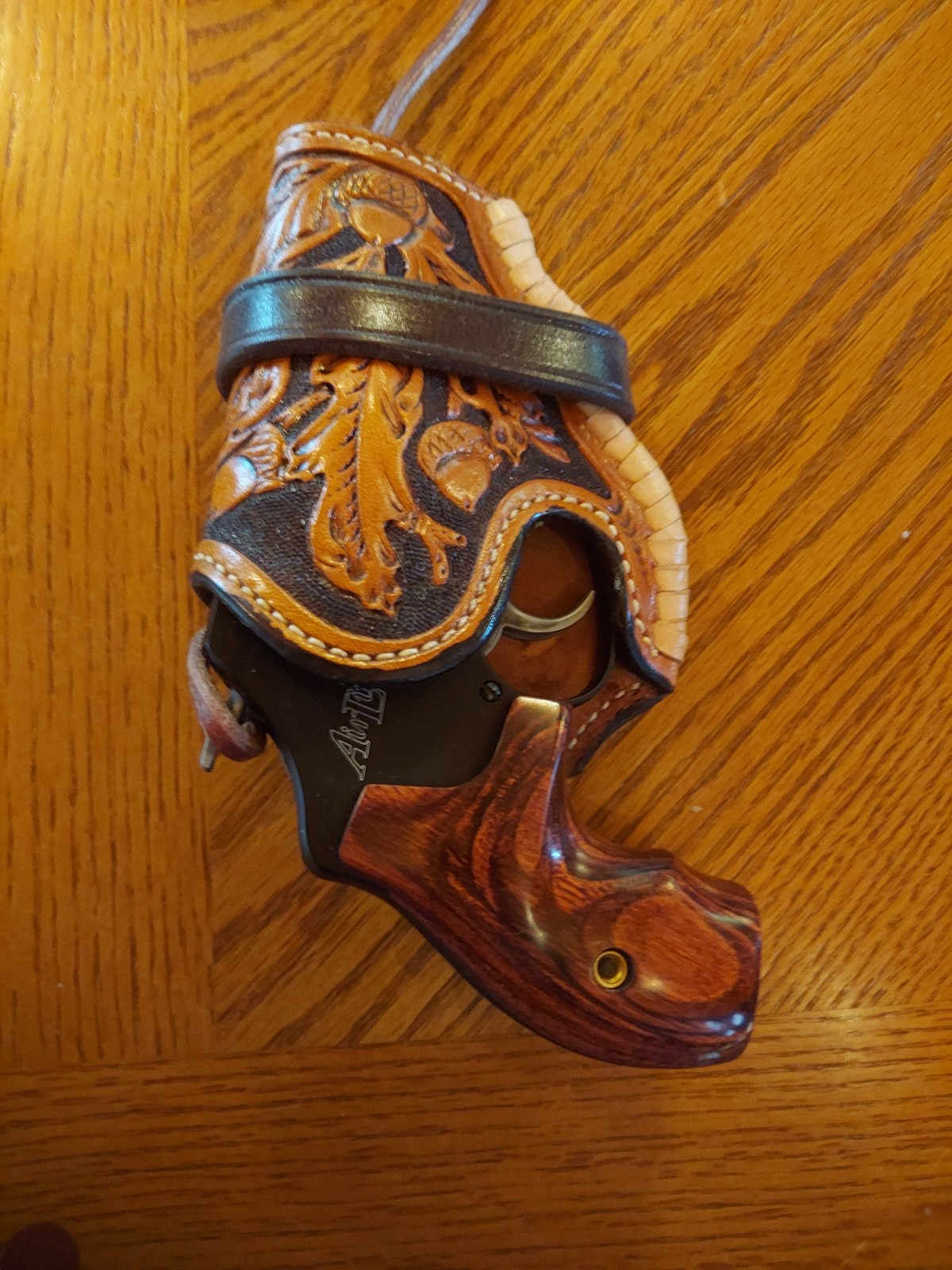 I had a custom holster done by my leather artist, Tom Angle from Jordan Valley, Oregon. It's pig skin lined and nicely tooled. I haven't contacted S&W regarding a 22lr cylinder, mainly because I have 3 other 22's including an older 22 Airweight titanium that I keep in my golf cart.