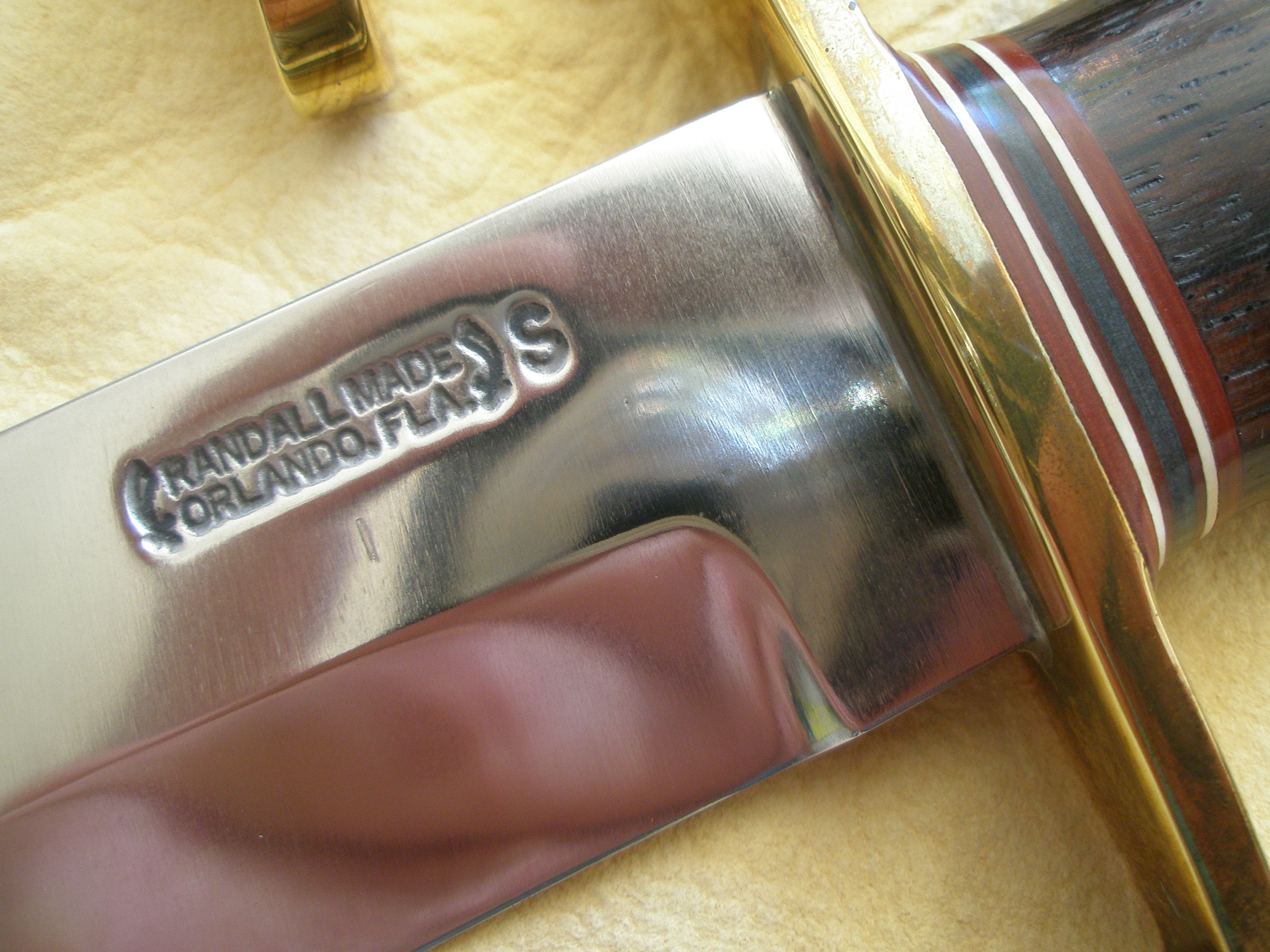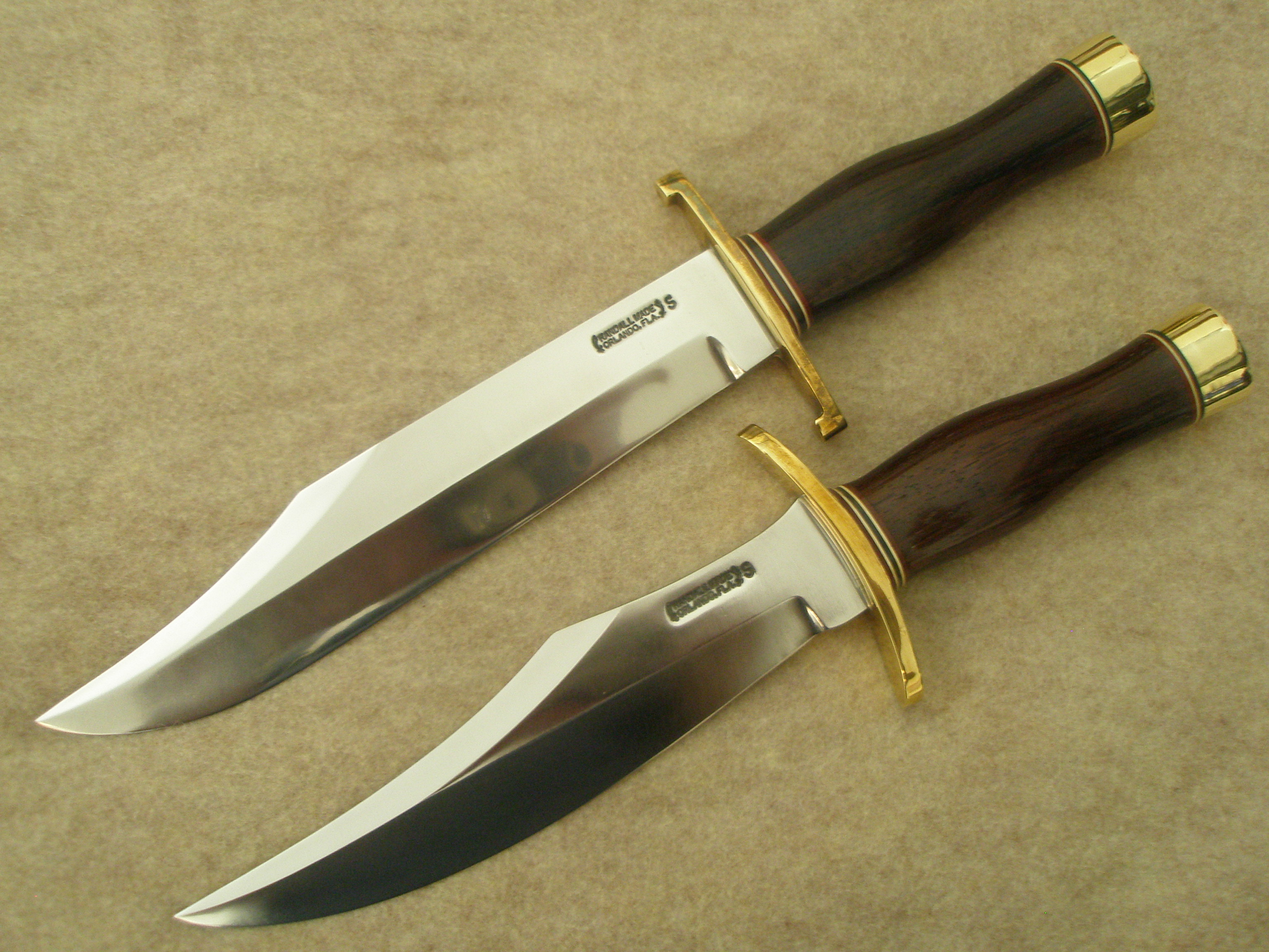 Buck: Thanks for bringing the pictures up. Each knife has a marking below the logo. It can be seen on the closeup of the 12-9. They're both marked the same. The original owner, knifemaker Earl Witsaman, was good friends with Bo Randall and had these knives made on request. Randall marked the knives this way, but I don't know what it signifies. Both knives have the exposed flat brass nut. Thx again for the photo help.