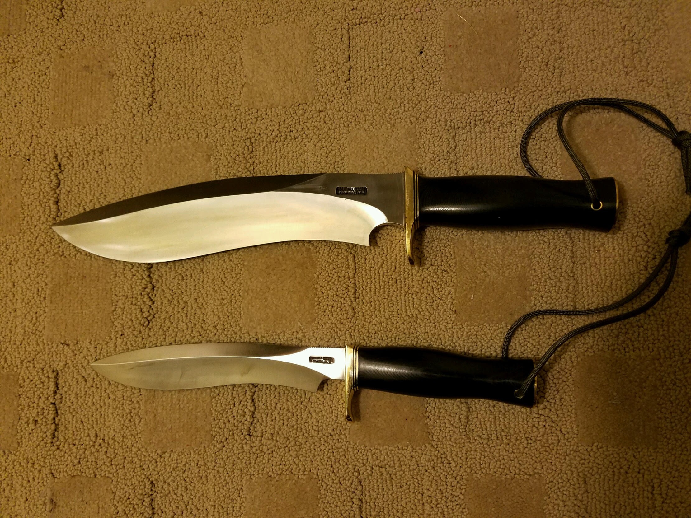 Great comparison, especially note that although both blades have "earlier" grinds, the bottom knife is drilled for a lanyard. Big variation in the spacers too. Six in. blades?