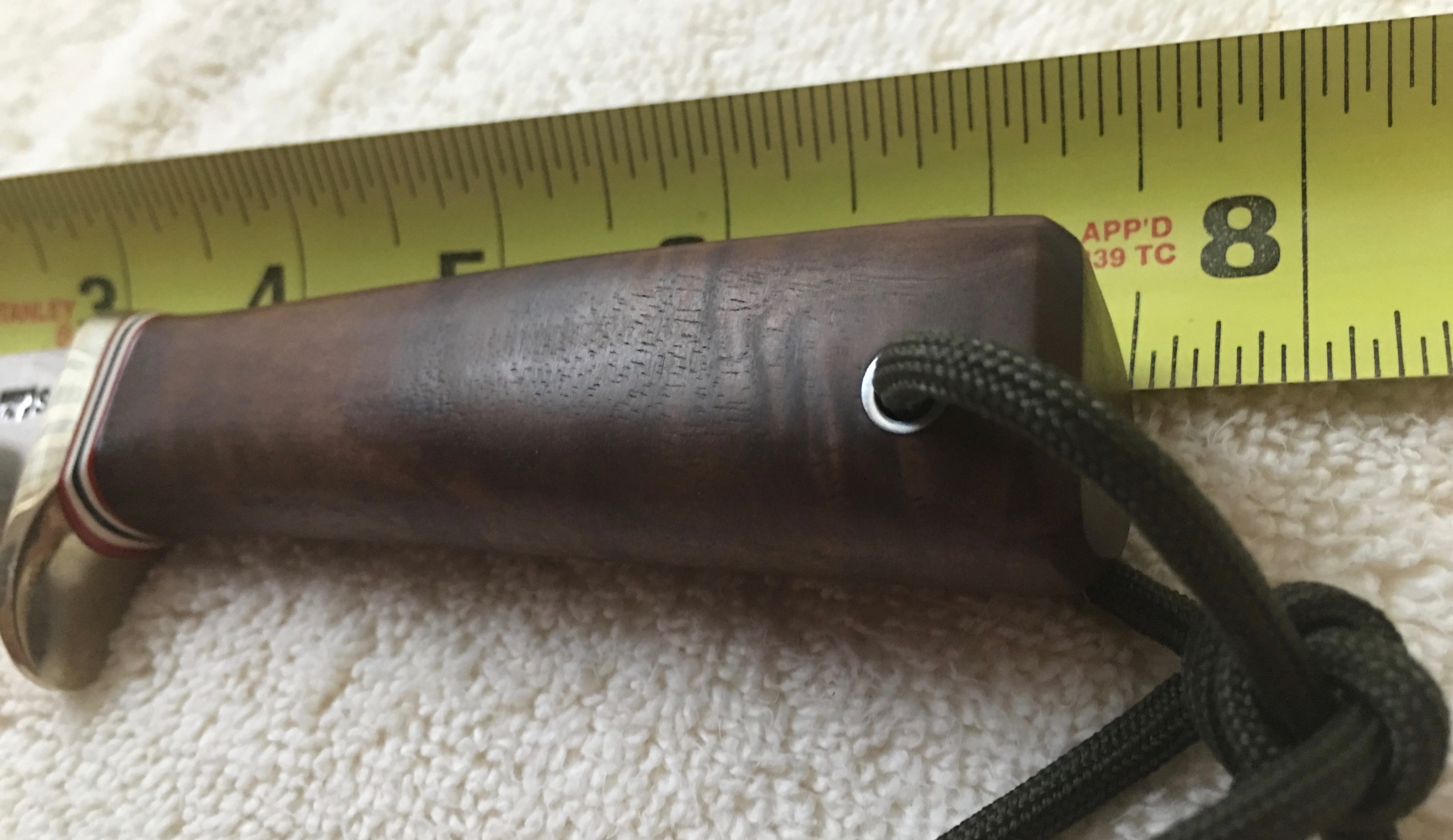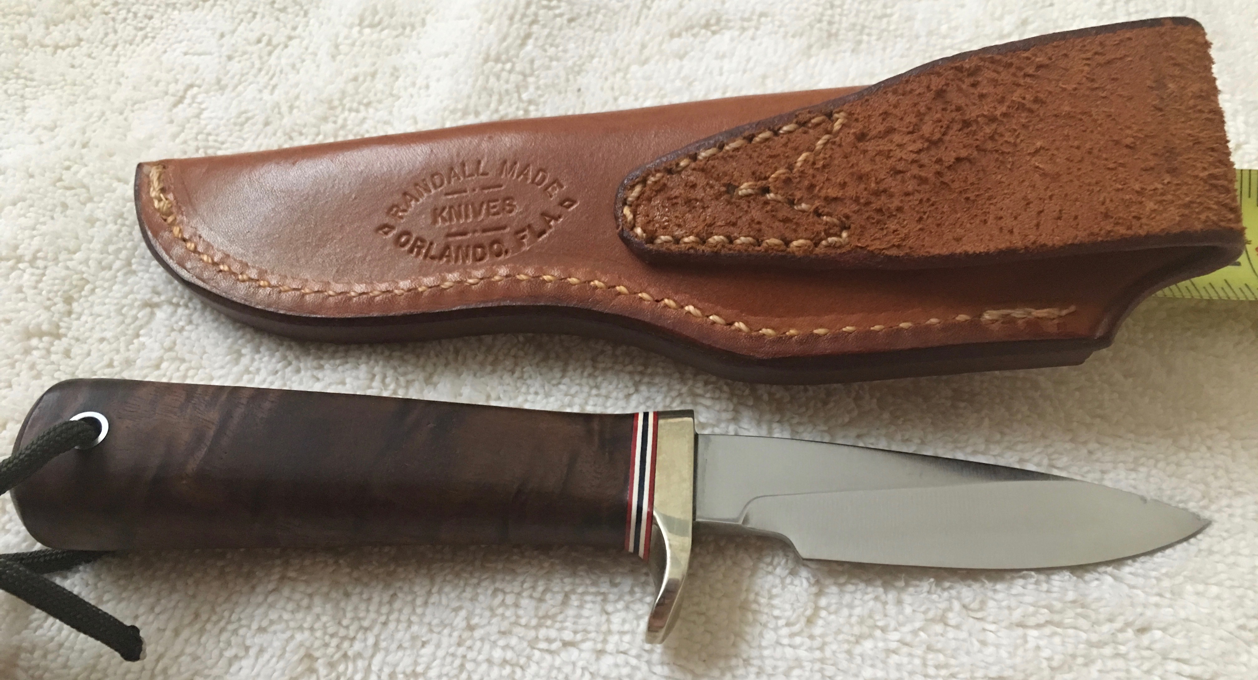New member here. Hope this is posted in the correct area. I got this knife 2nd hand and don't know what model it is. The shape suggests a 26, but according to the Randall catalog, it should be a 4 inch blade-this is 3 3/8. The catalog pictures a sheath with a strap and snap-this is more like a #10, but not exactly. Did they make a 26-3? It's 7 1/2 inches overall, stainless blade, nickel silver hilt, maybe walnut handle that flairs out at the end, wrist thong. Any thoughts?