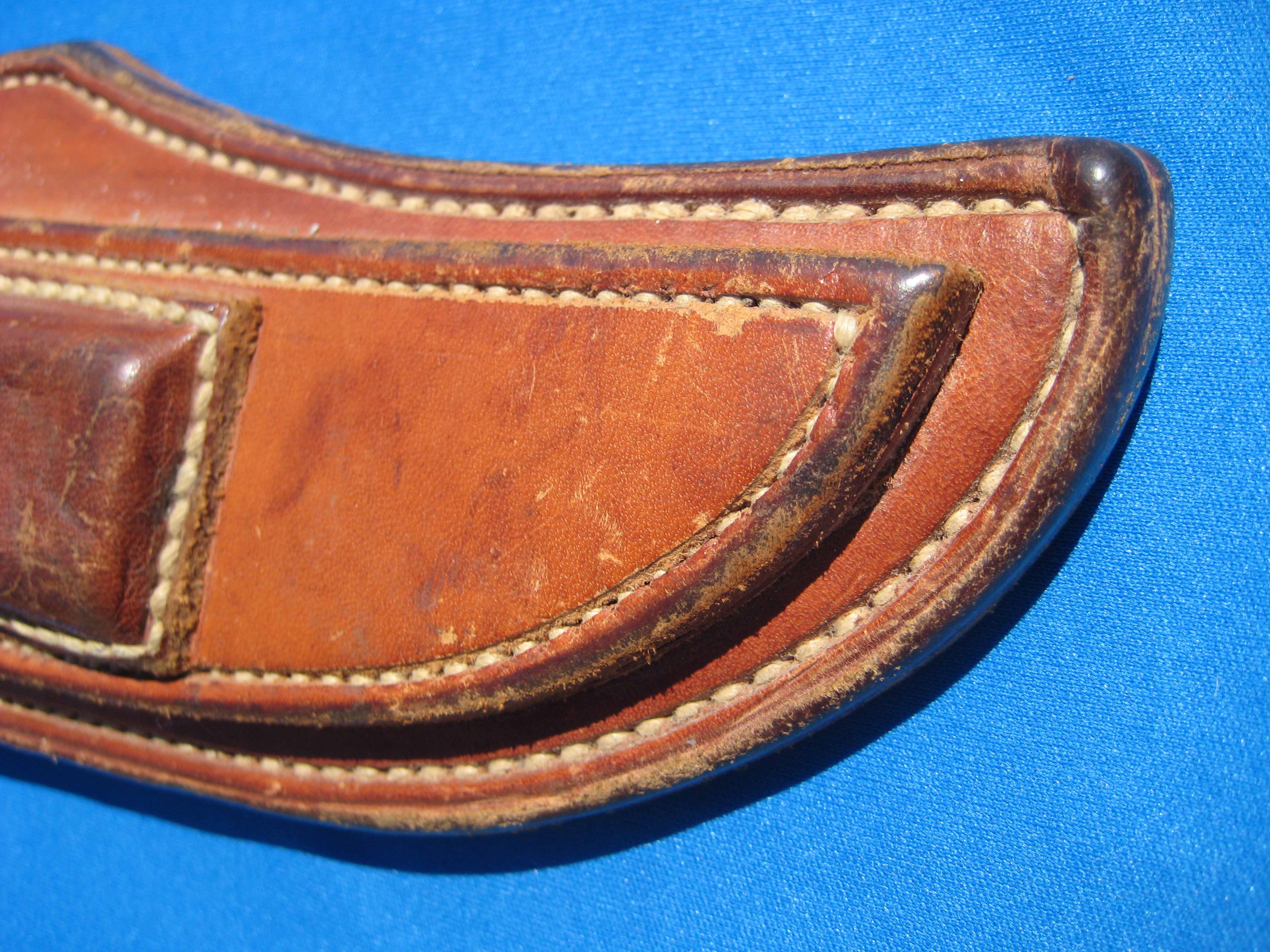 The sheath is an unriveted Heiser sheath. Note the high position of the keeper strap.