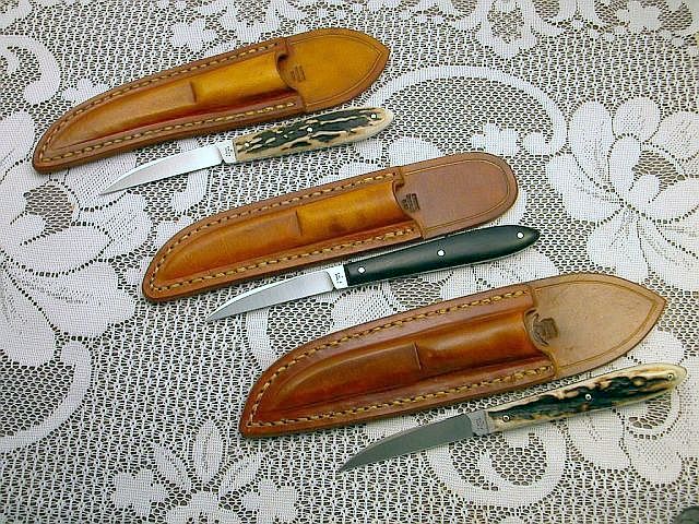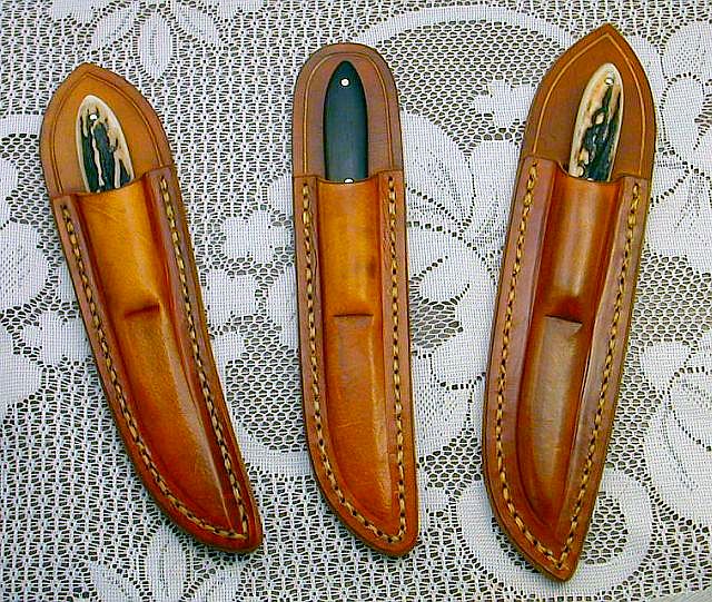 The first on the left has a shorter and wider stag handle. The ebony one will be pocket carried so I made the sheath a bit smaller than for the stag knife on the right. (Yea Whiteman, the one on the right is yours) The second image colors are messed up but you get the idea. They all look better up close and personal.