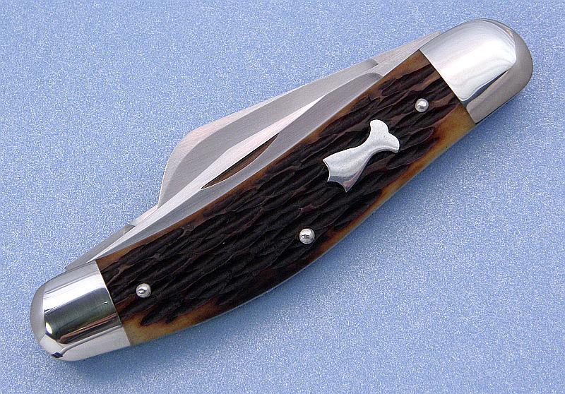 Tony finished this one yesterday...a 3 3/4 Remington Bone Sowbelly. Blades and springs are ATS-34 and fitted with 410 SS liners and bolsters, SS pins and pinned SS shield. SEXY!:D