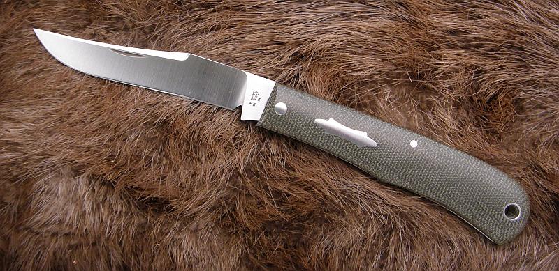 Here we have a 4.5" BP done in a green canvas shadow. Tony used CPM D-2 for the blade and this knife is going to be performance tested on a high tech cutting machine. It's scary sharp!
