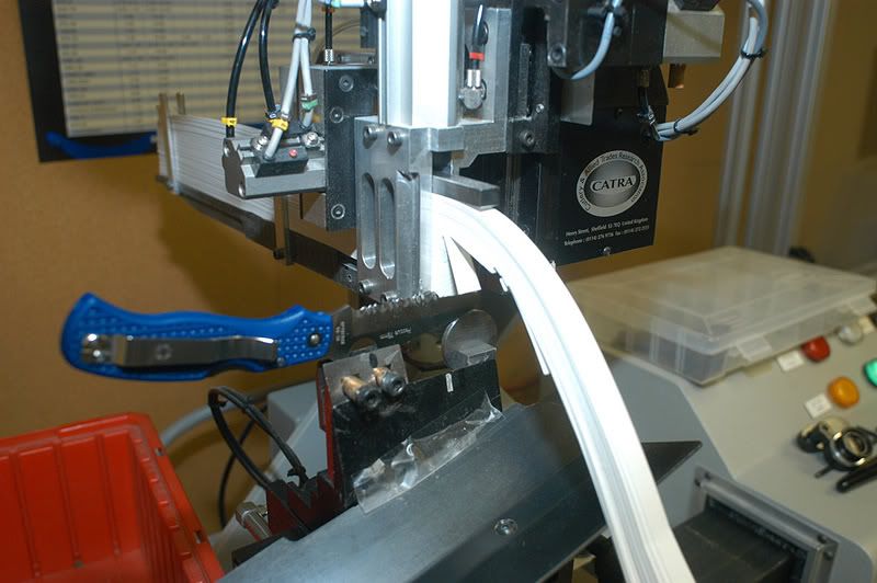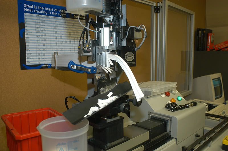 Here are a couple of photos of a CATRA machine in action that I took at the Spyderco factory in Golden several years ago. (I like that slogan on the chart on the back wall.)