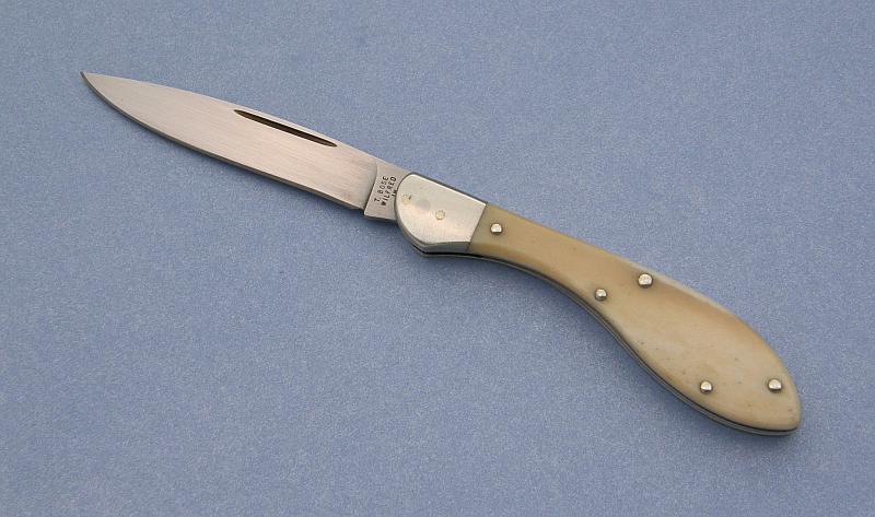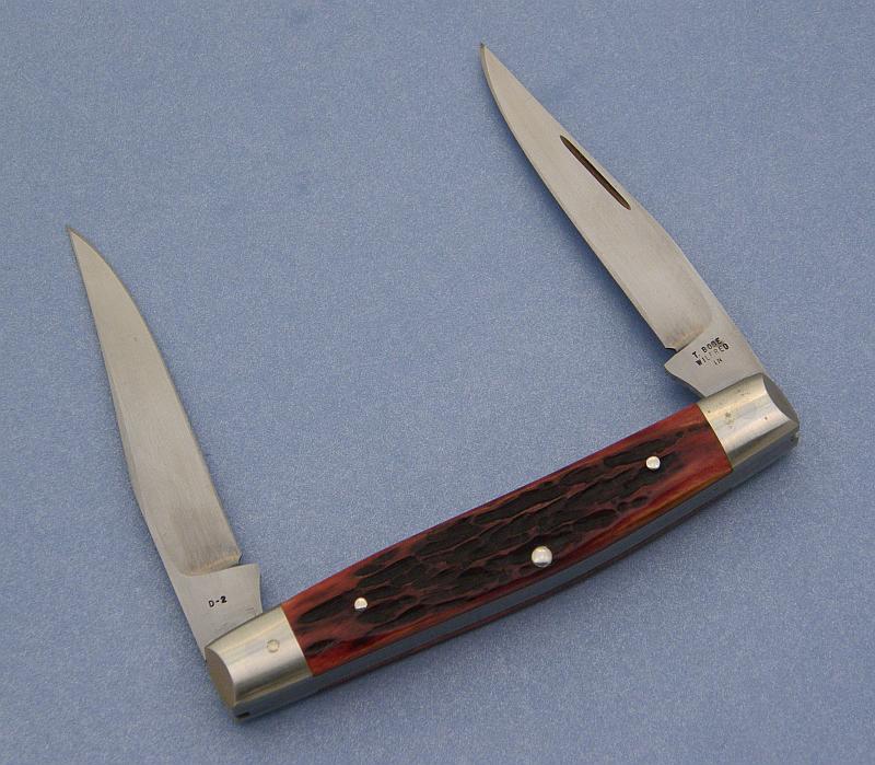 This is a gents knife Tony used to make. It is 3 1/4" with D-2 blade and spring, long pull, dovetailed bolsters, and cattle bone handle. Tony used to get raw cattle bone from a place down the road in Hymera. He'd boil and process the bone himself and, judging from the way this bone held up, he did a real nice job with it. From the early '80s. Check out all those pins!:eek: