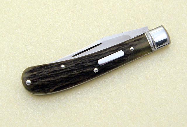 Once in a while Tony would get a knife returned back to him for one reason or another. Apparently somebody didn't like green stag and Freddie said, "I'll take it" when this one came back home. This one was made in the late '80s. It's a half trapper and has ATS-34 blades and springs. The bolster has what we call a "Cattaraugus Flute"(basically it is straight, doesn't follow bolster radius) Long nail pull on the blade.