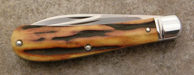 And a rare amber(dyed) stag 3.5" Wharncliffe trapper with D-2 blades and springs, Catt. fluted SS bolsters.