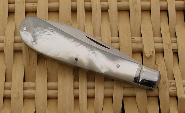 A MOP gents knife from the late '80s, a little over 3" with D-2 blade and spring, stainless liner and bolsters w/Catt. flutes.