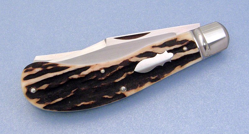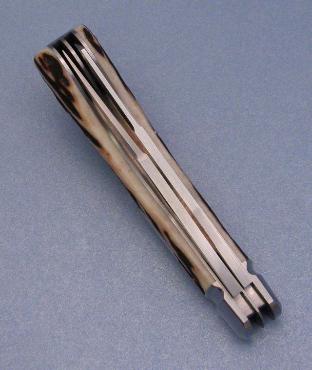 The saddlehorn is one of the hardest patterns to handle with stag due to the size material that is needed. It's very easy to end up with a knife that is too thick at the back end due to the shape, but Reese did an excellent job on this one(is there ever a doubt) ATS-34 blades and springs and stainless hardware.