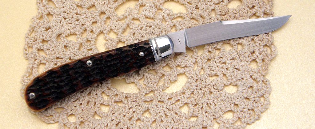 This 3 1/8" single blade trapper is hafted with rare Napanoch bone and built on the serpentine frame. Blade and spring is D2.