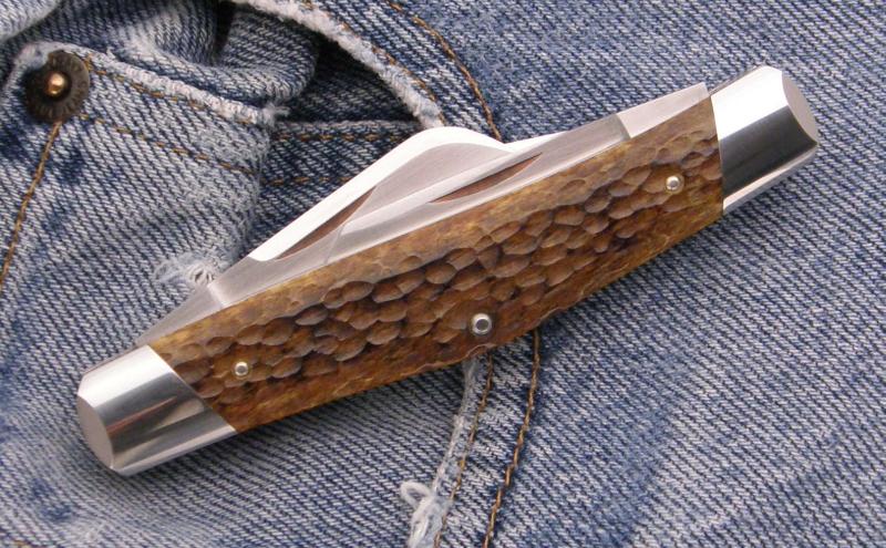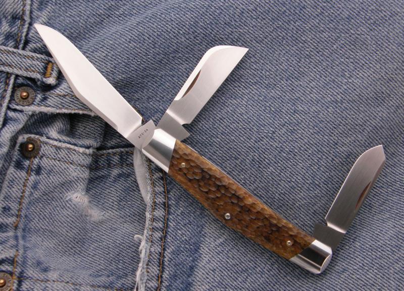 ....and another of Reese's goin to Atlanta. This 4" 3-blade stockman has bone that was dyed and jigged by the maker. ATS-34 Blades.