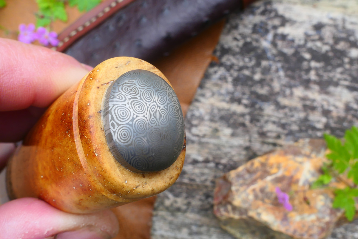 Guard and butt cap from Heimskringla Damasteel and an oosik handle with a Stellers seacowrib spacer.