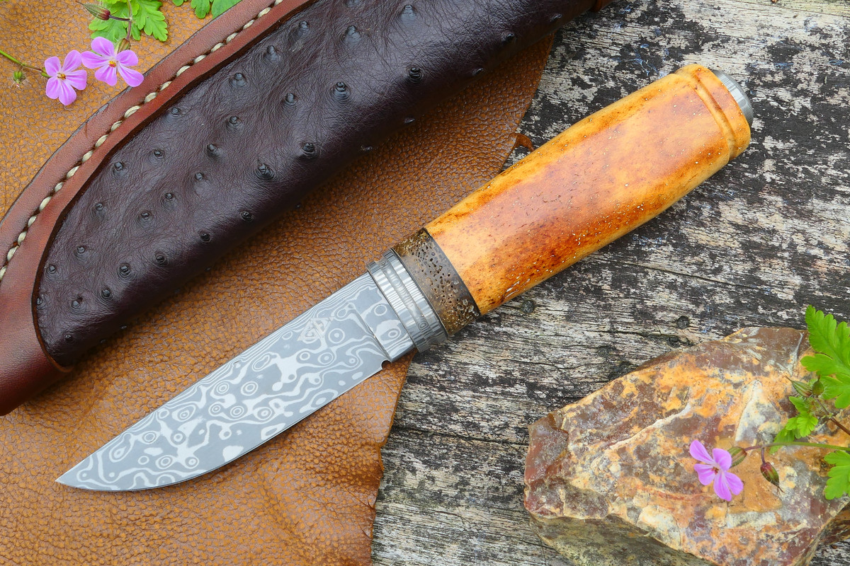 Selva puukko with a 4" blade of stainless (ATS34/440C) damascus.